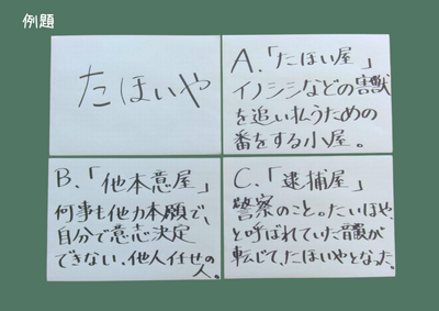 午前の部では、自己紹介の後に「図書館たほいや」を実施しました。今回は班ごとにお題となる言葉を事前に用意し、その言葉を最初に辞書で正しい意味を確認。班ごとに三択クイズを作成し、他班に出題するというアレンジしたやり方で行ったのですが、みなさんが考えた「嘘の意味」がどれも本当っぽく、とても盛り上がったクイズ大会となりました。図書委員の皆さんの発想の豊かさ、面白さに驚くとともに言葉の奥深さを楽しめた時間となりました。